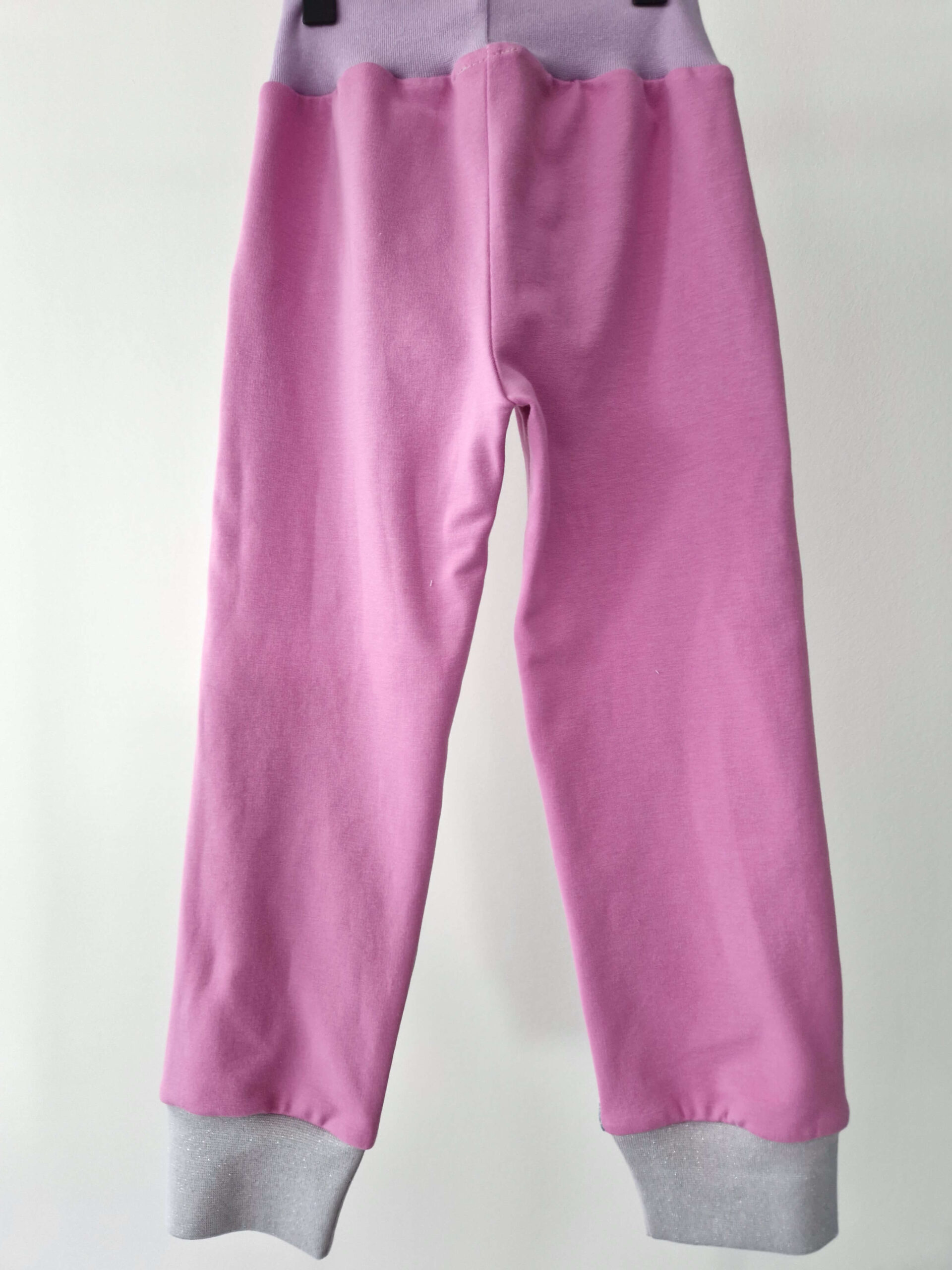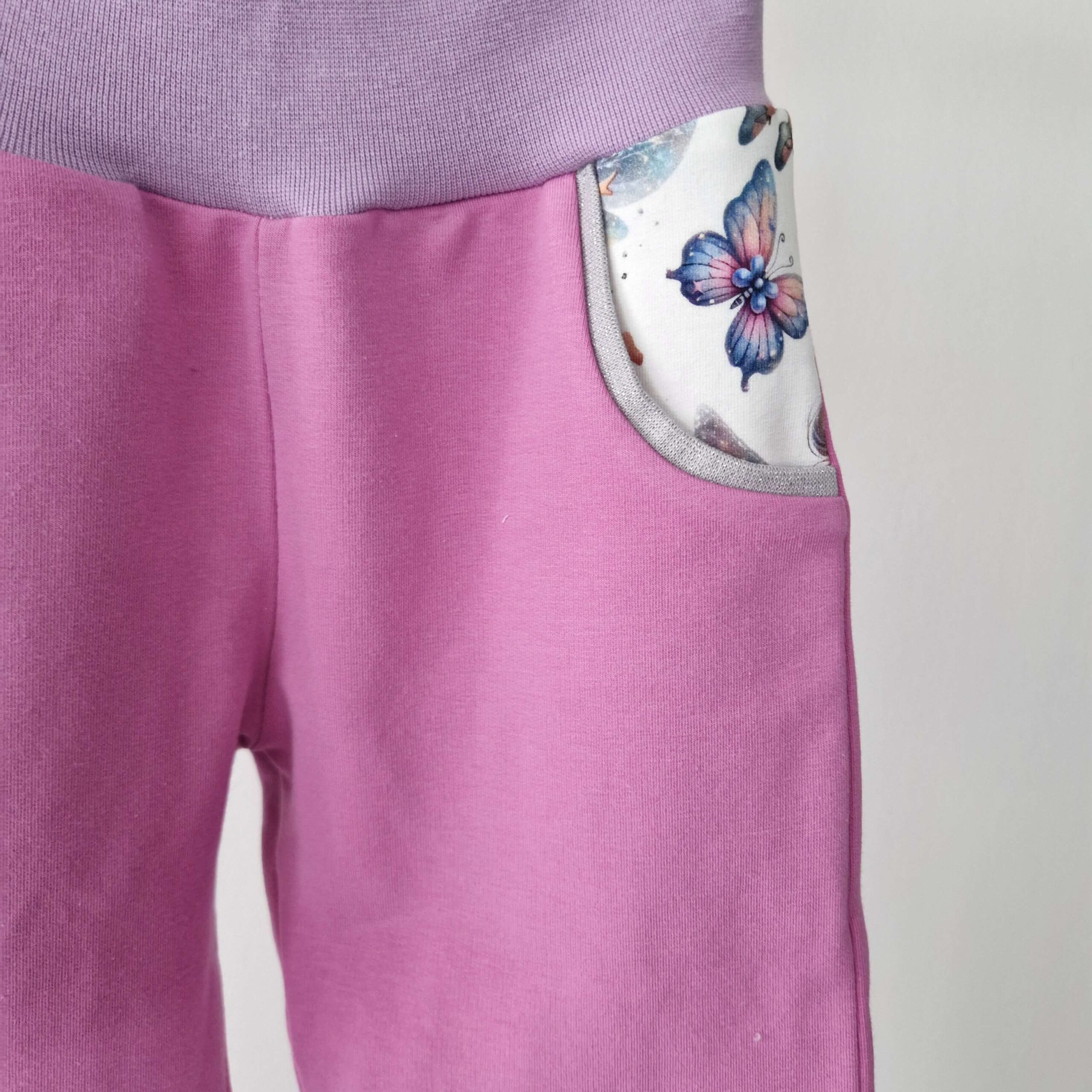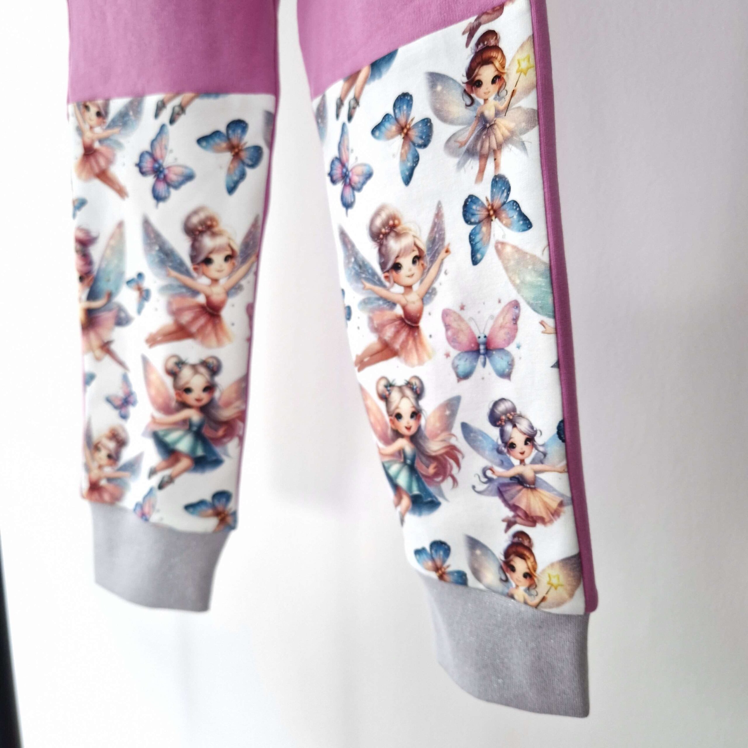 Sköna byxor i lila joggingtyg. Detaljer med sött tyg med älvor och fjärilar på framsidan av benen och i fickorna. Bekväm lila mudd i midjan och glittrig silver mudd som dekorativ detalj i fickan och snyggt avslut på benen.