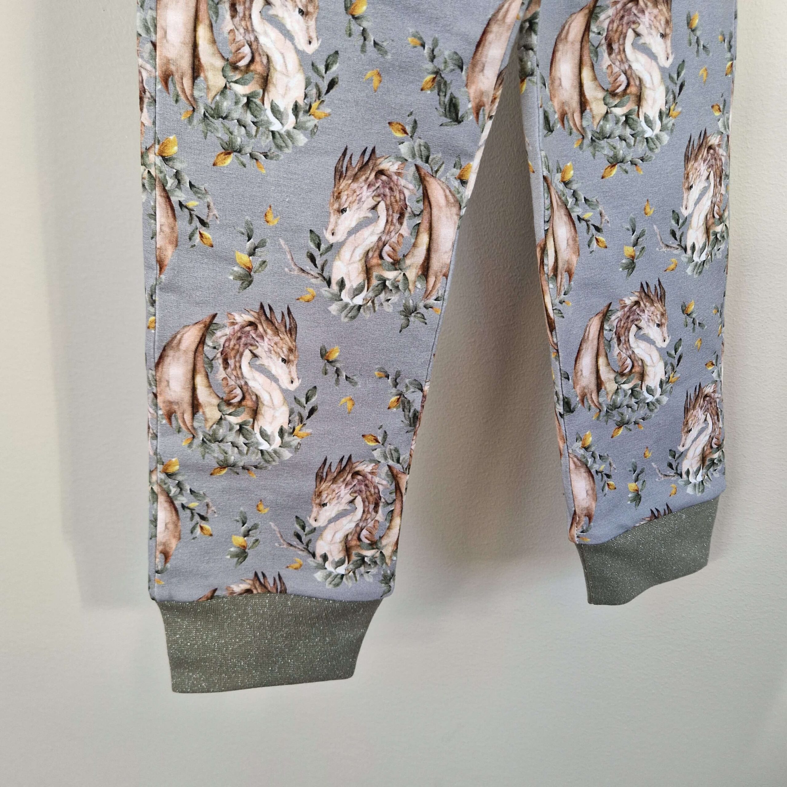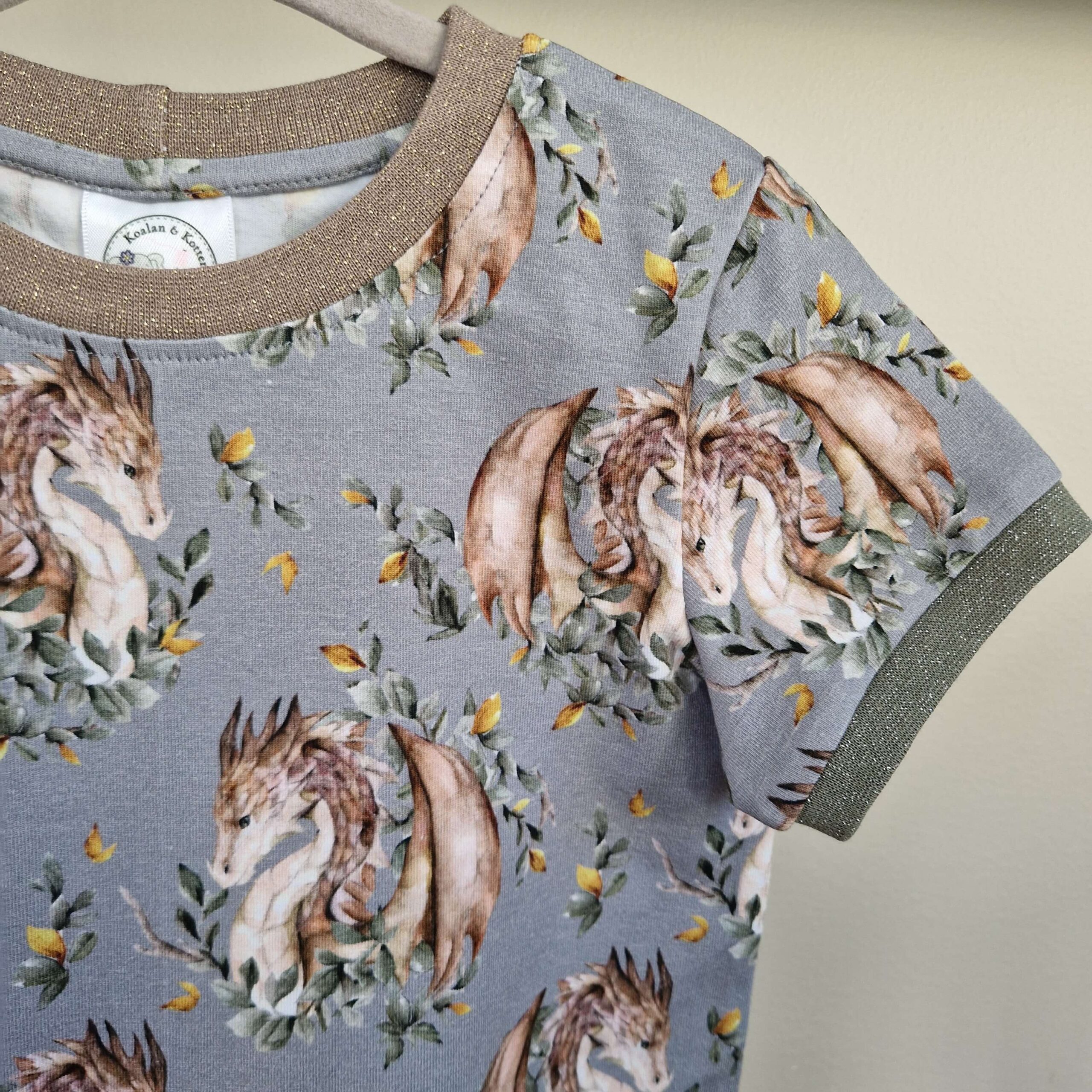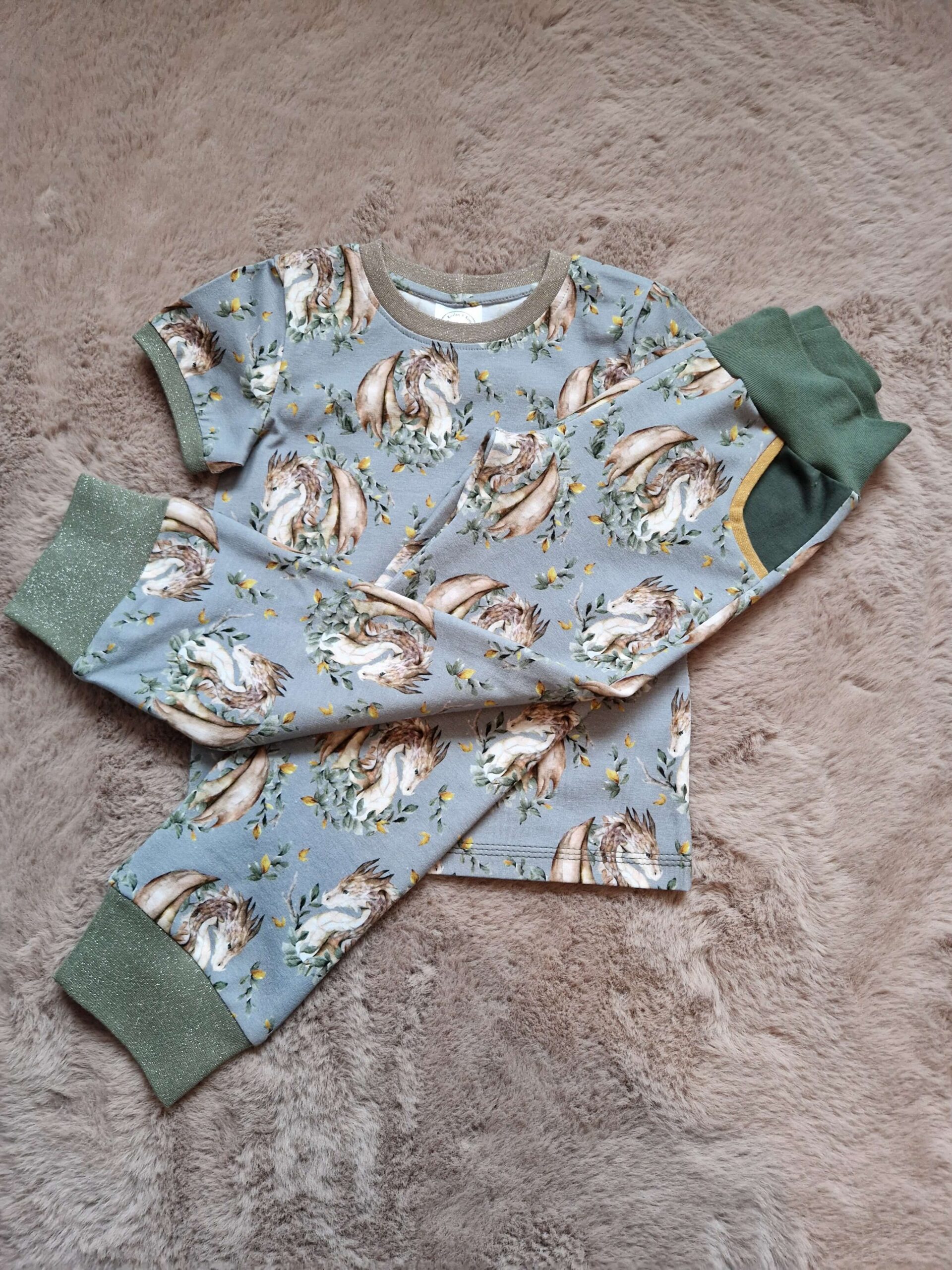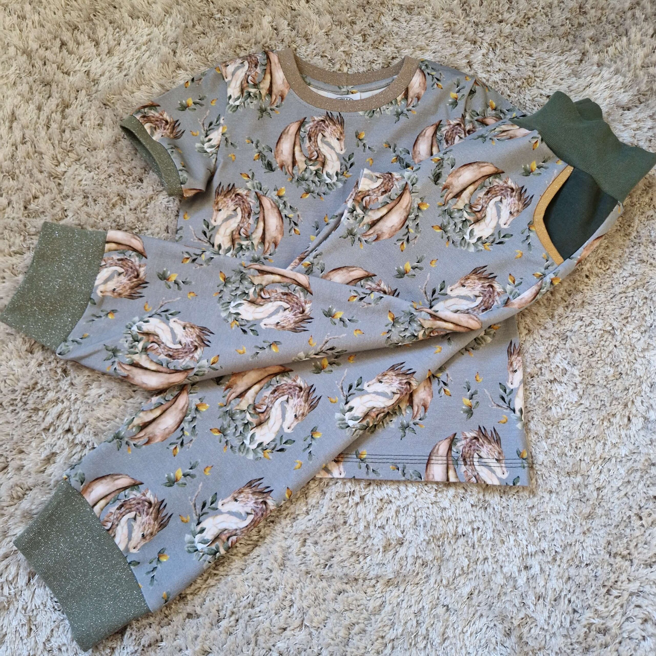 Mjukt och skönt matchande set med drakar. T-shirten är i trikåtyg med glittriga muddar i hals och ärmslut. Byxorna är i skönt joggingtyg med två fickor som har snygga och matchande detaljer.