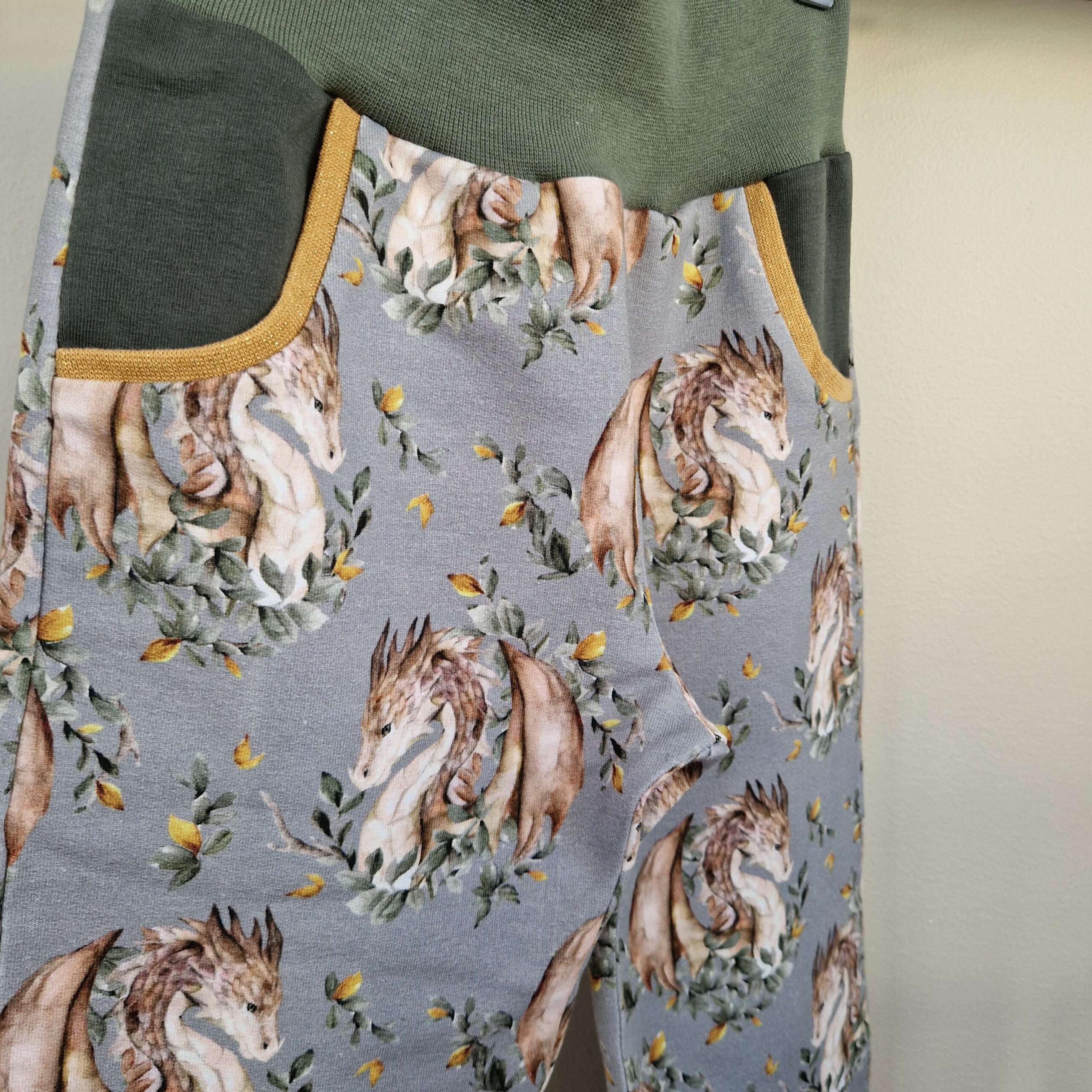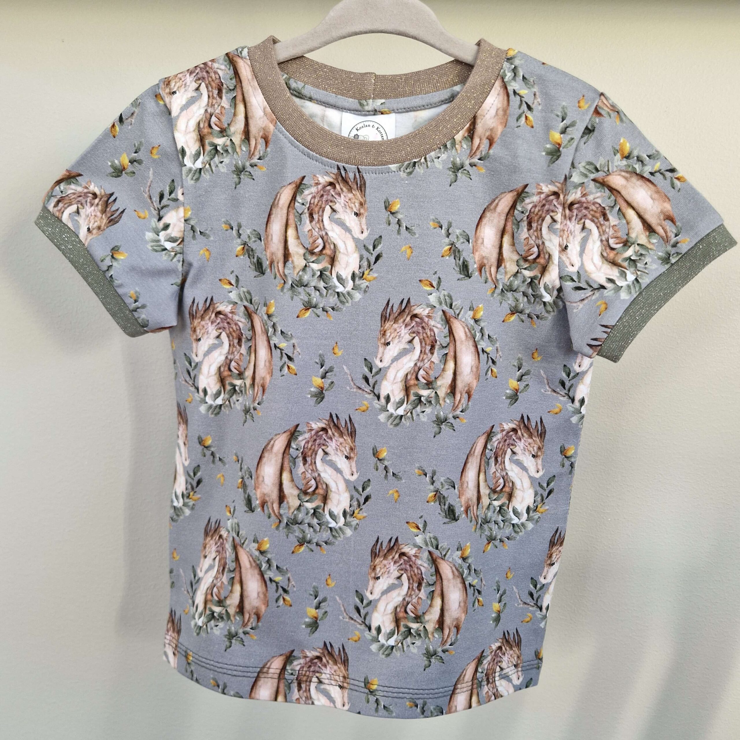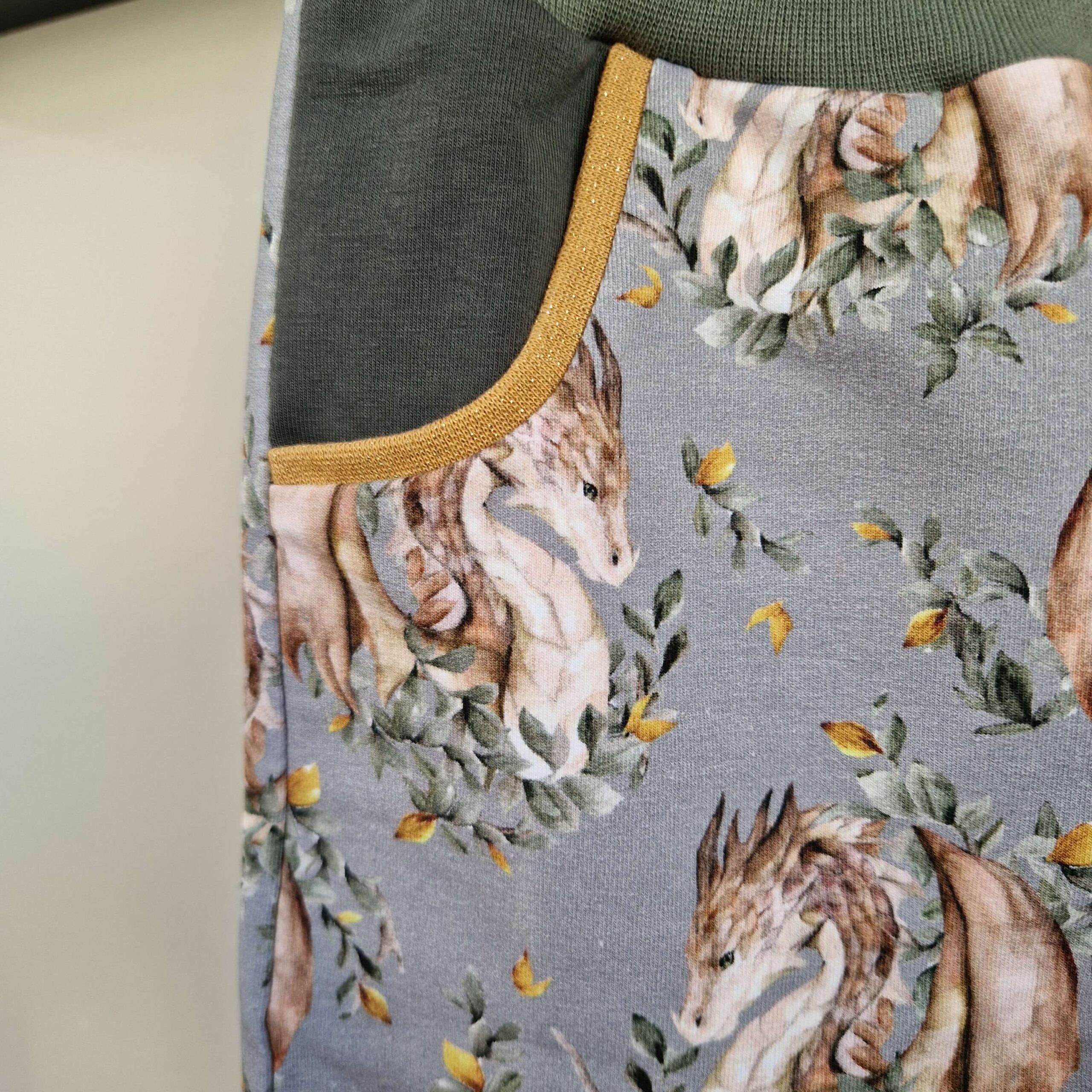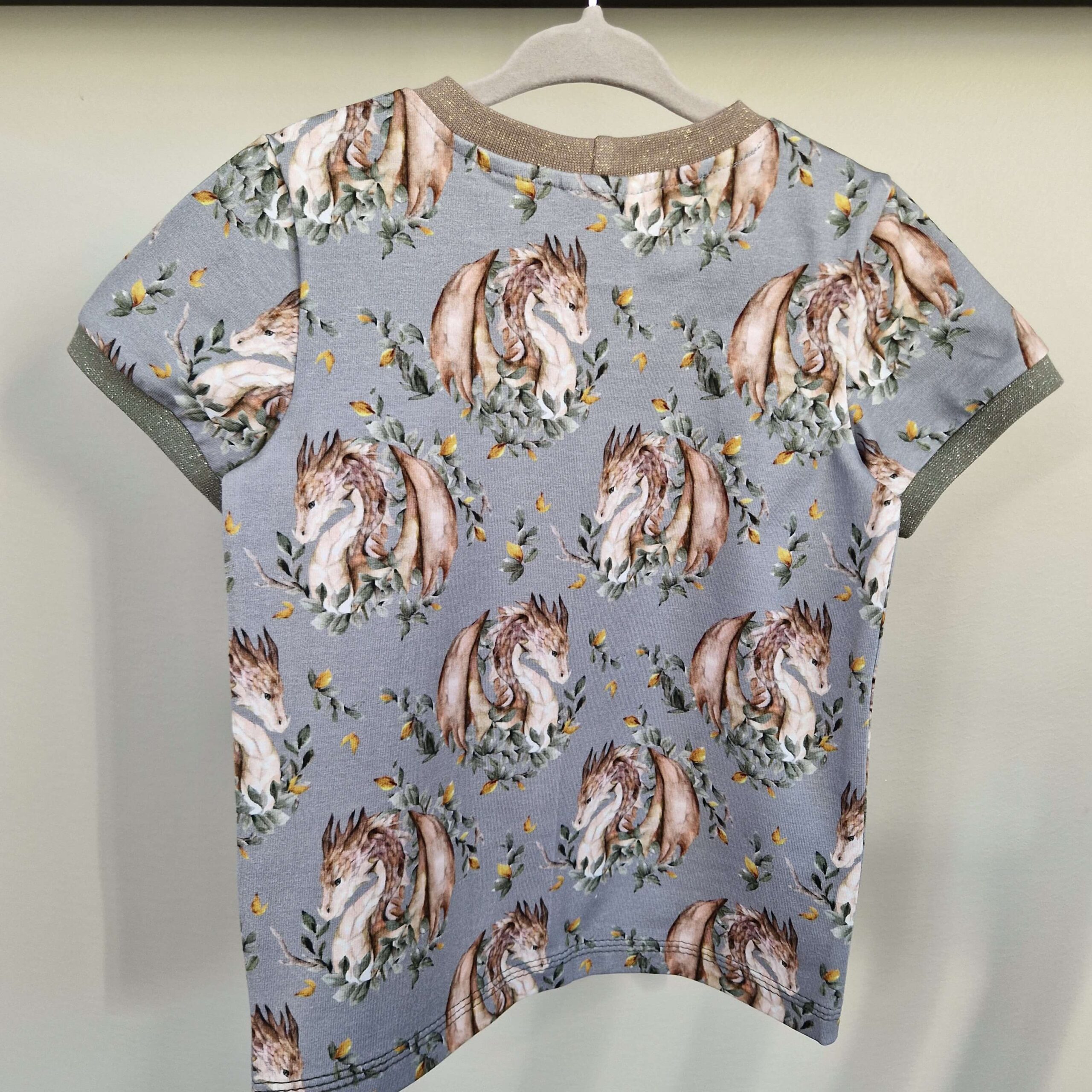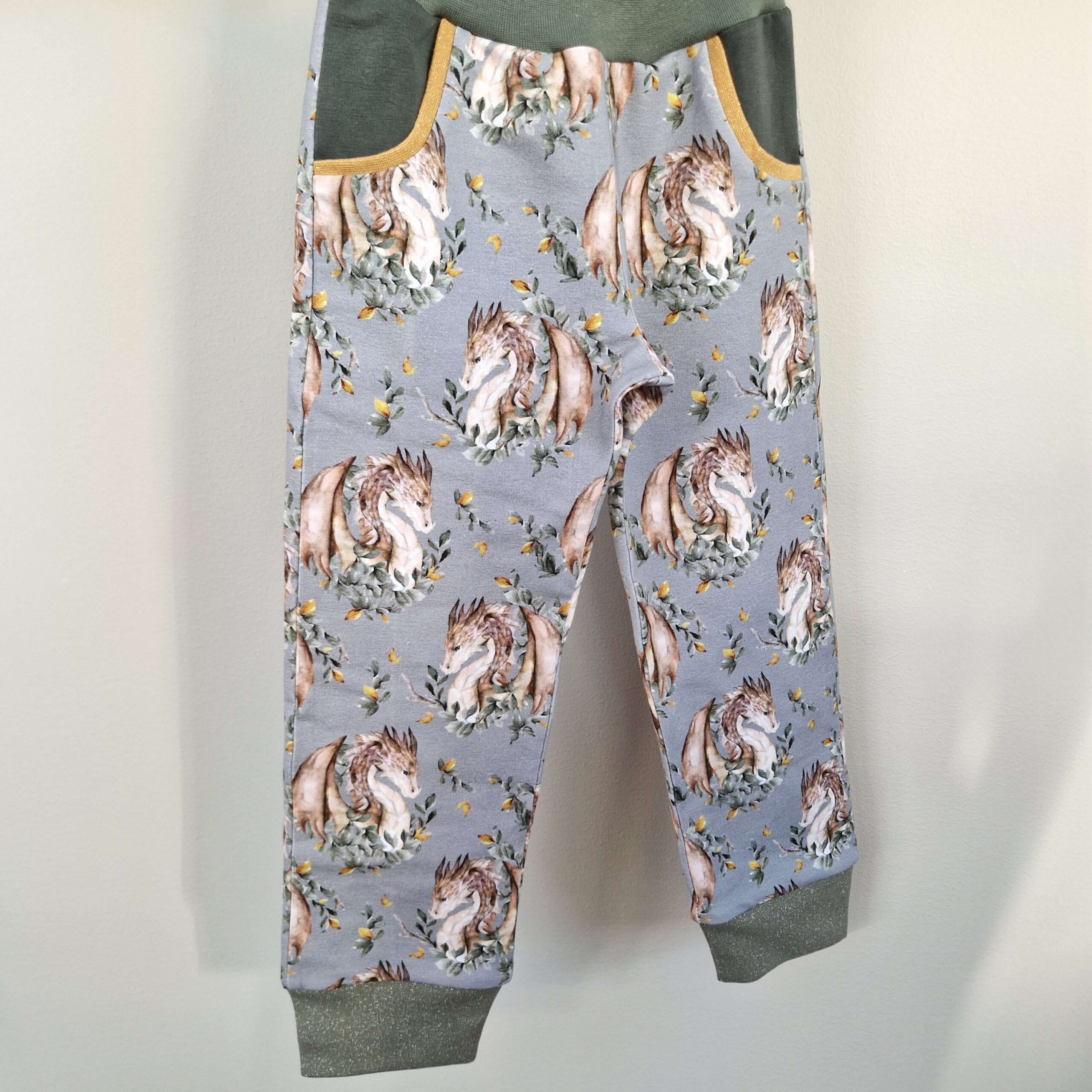 Mjukt och skönt matchande set med drakar. T-shirten är i trikåtyg med glittriga muddar i hals och ärmslut. Byxorna är i skönt joggingtyg med två fickor som har snygga och matchande detaljer.