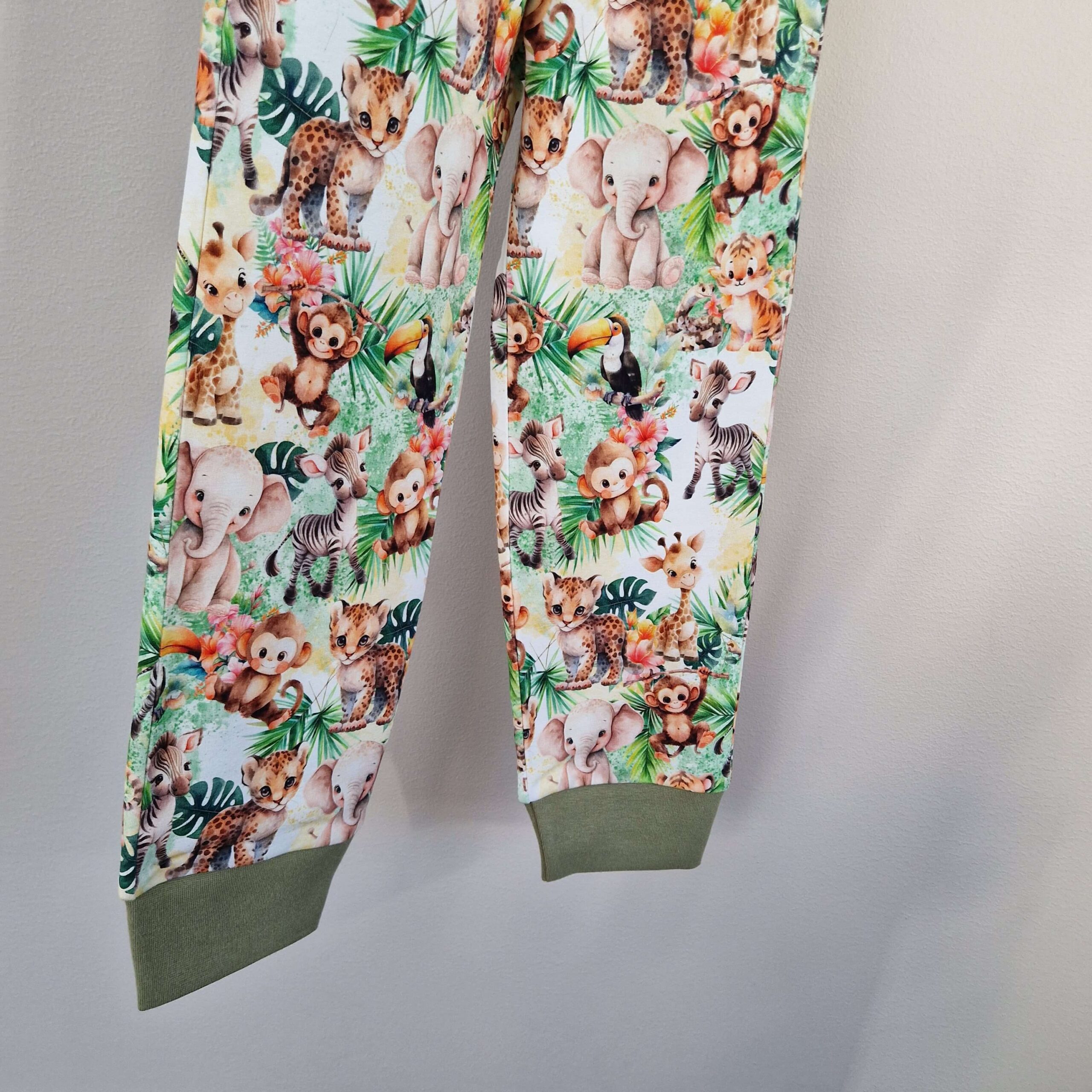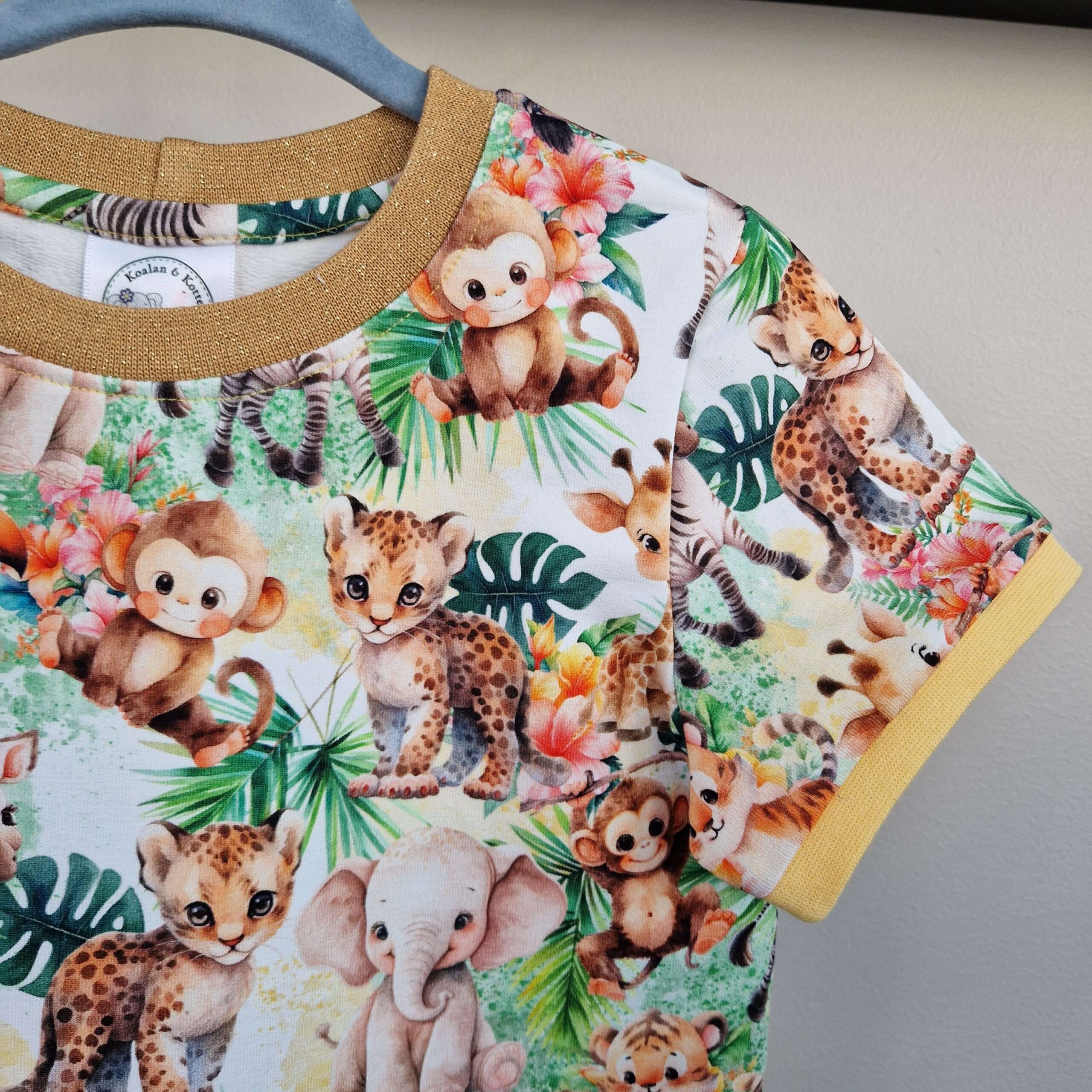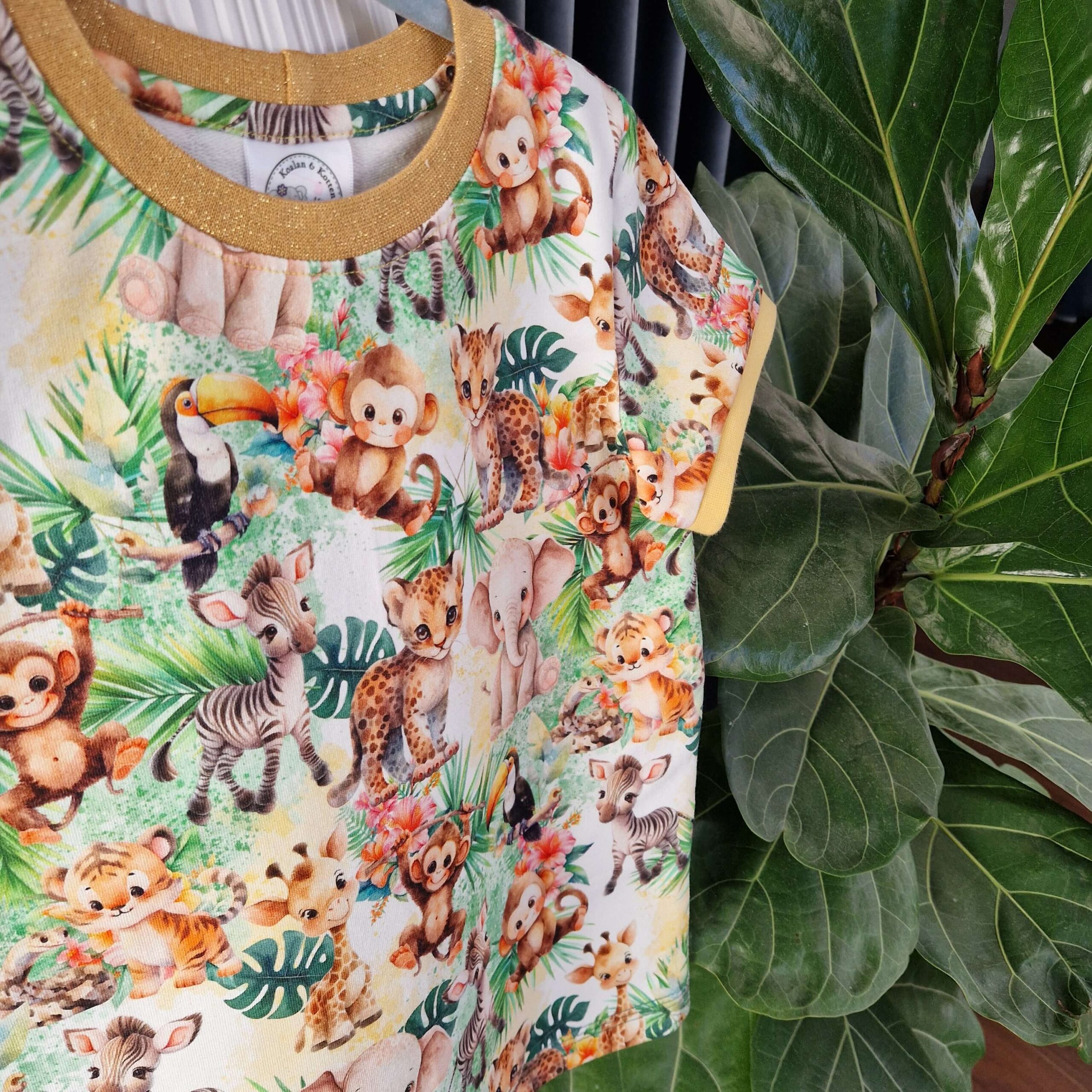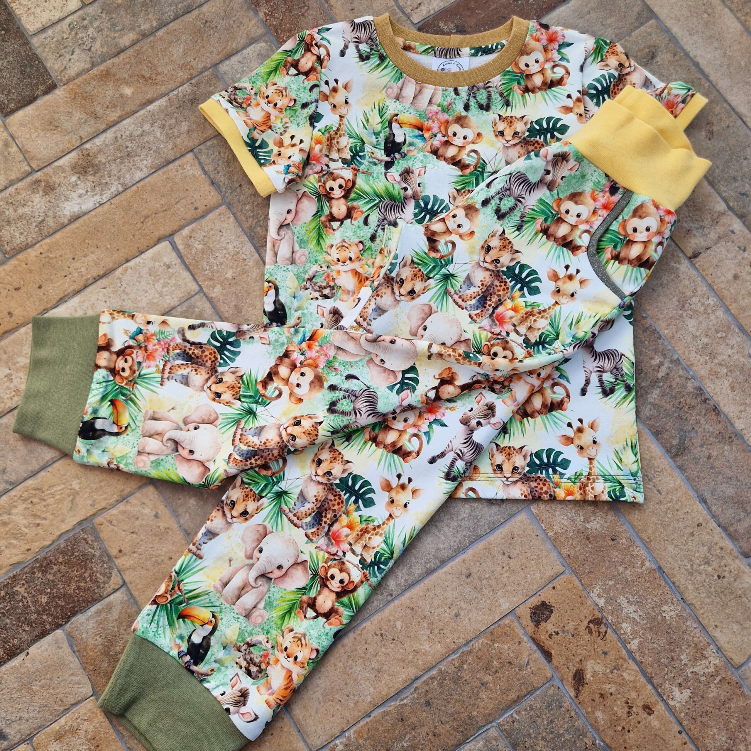 Mysigt matchande set i joggingtyg med söta djur. Bekväm byxa med två fickor och sköna muddar i midja och benslut. Fin t-shirt med guldglittrig mudd i halsen.
