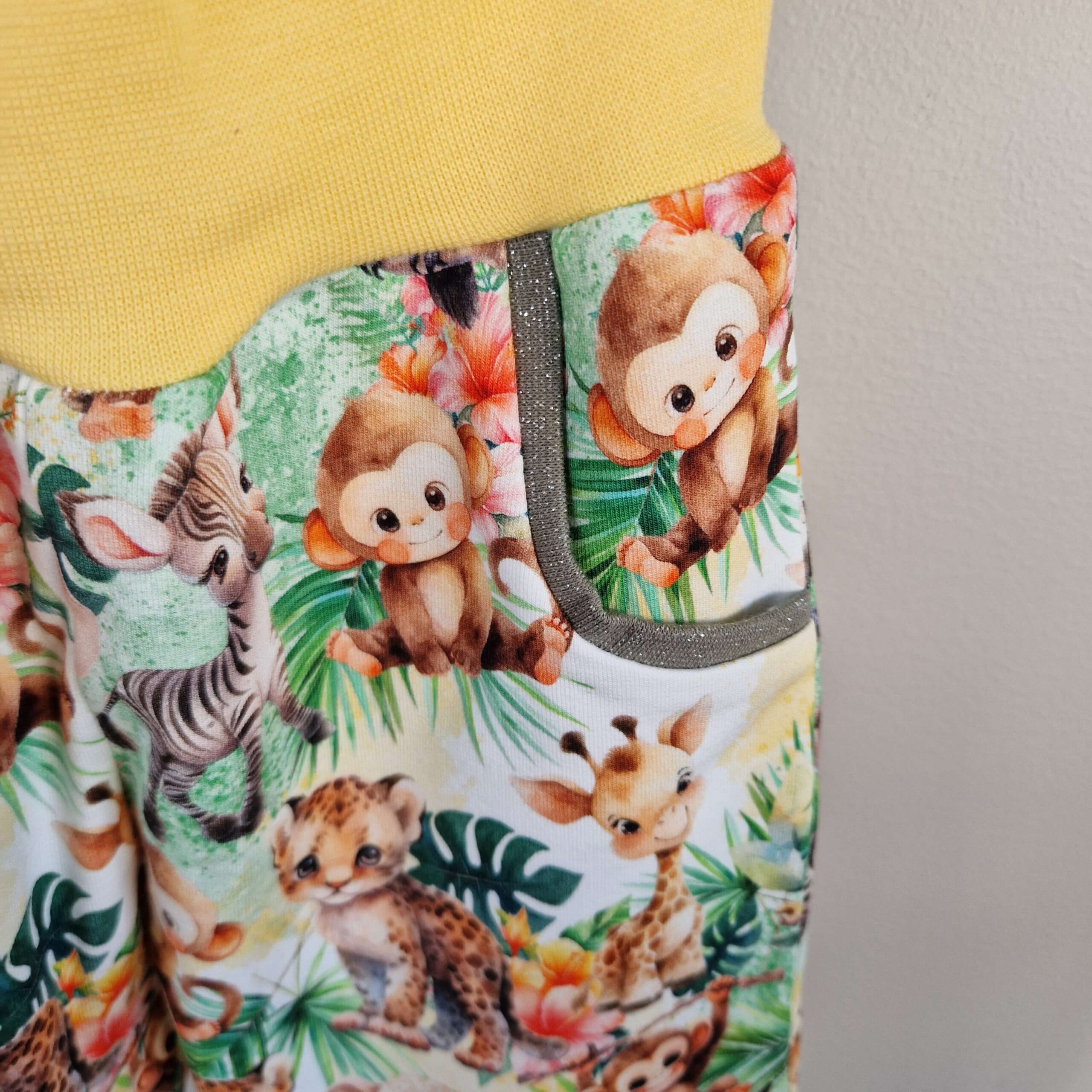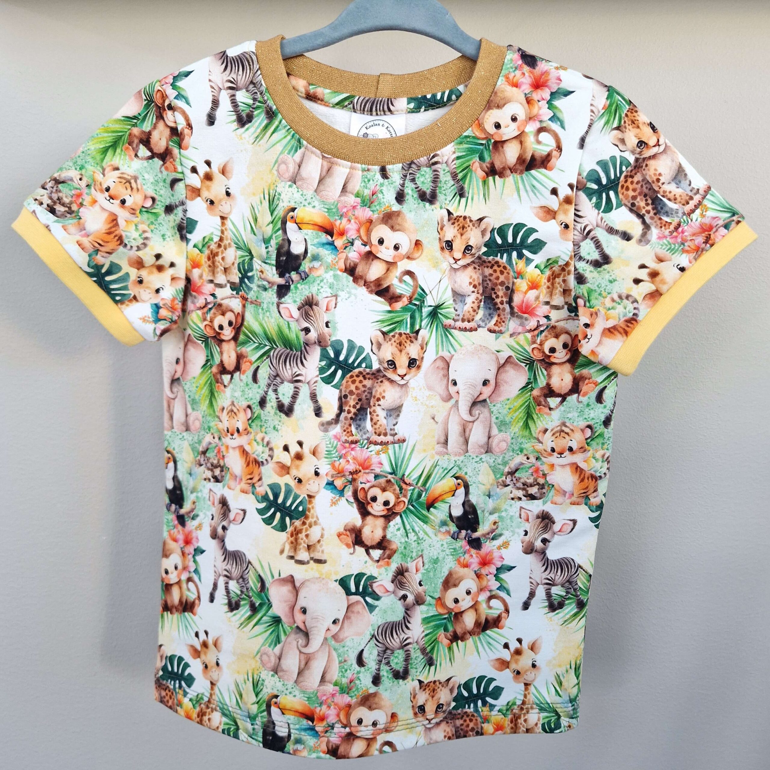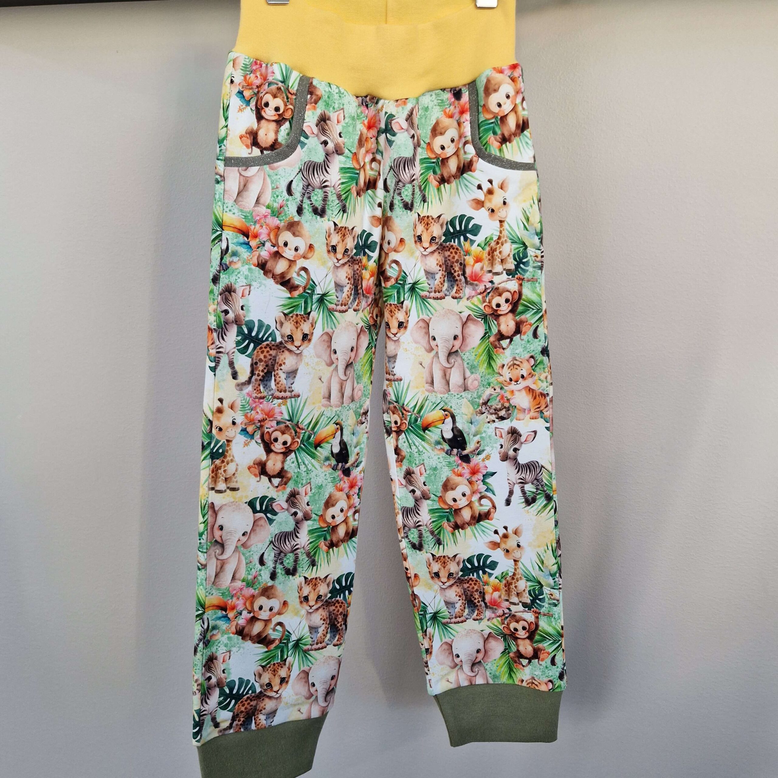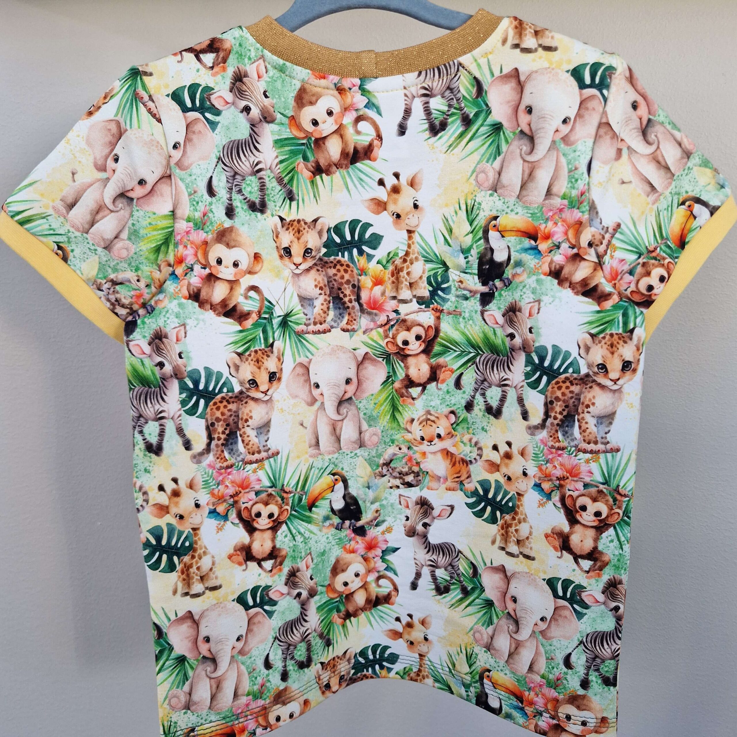 Mysigt matchande set i joggingtyg med söta djur. Bekväm byxa med två fickor och sköna muddar i midja och benslut. Fin t-shirt med guldglittrig mudd i halsen.