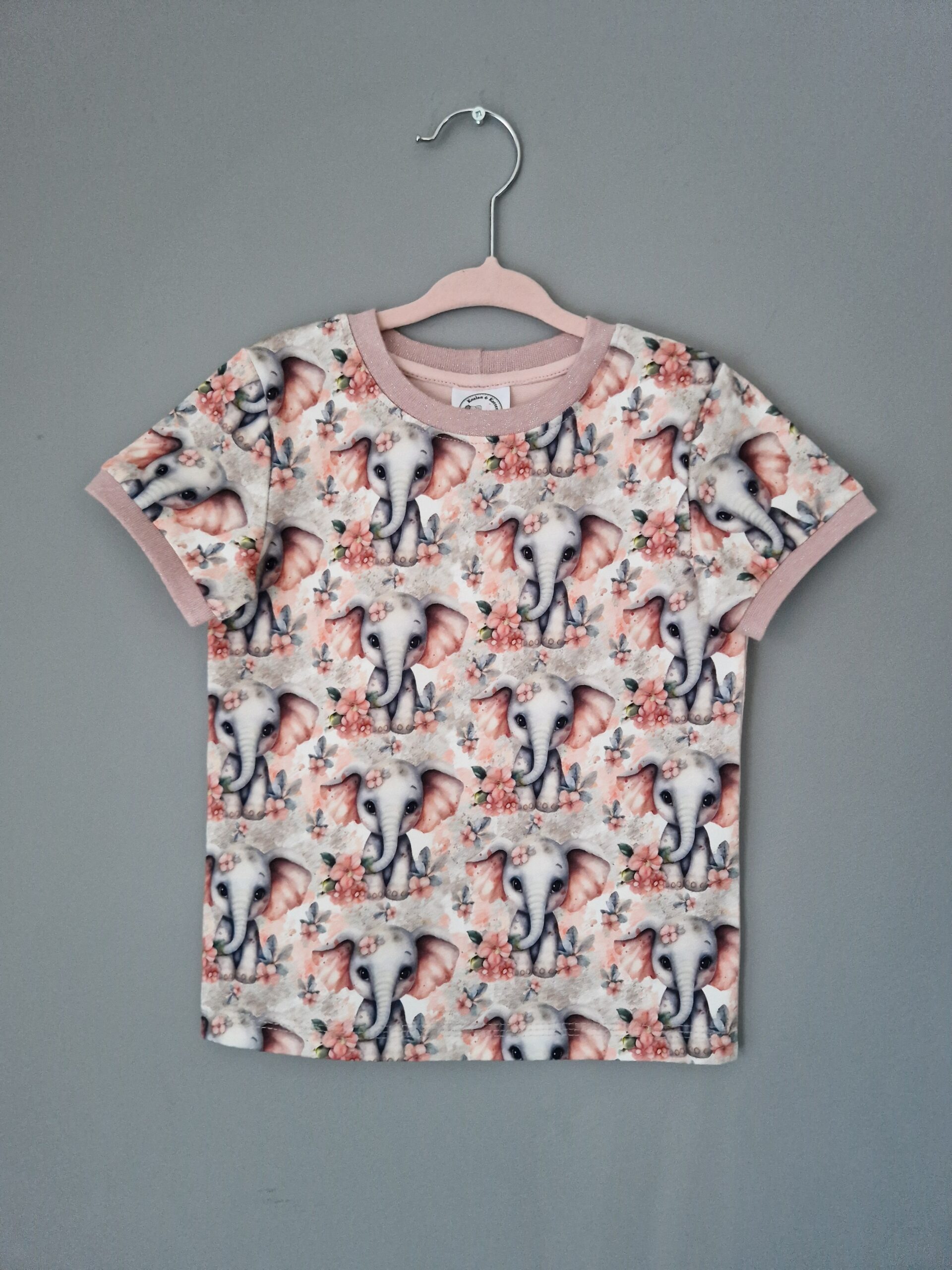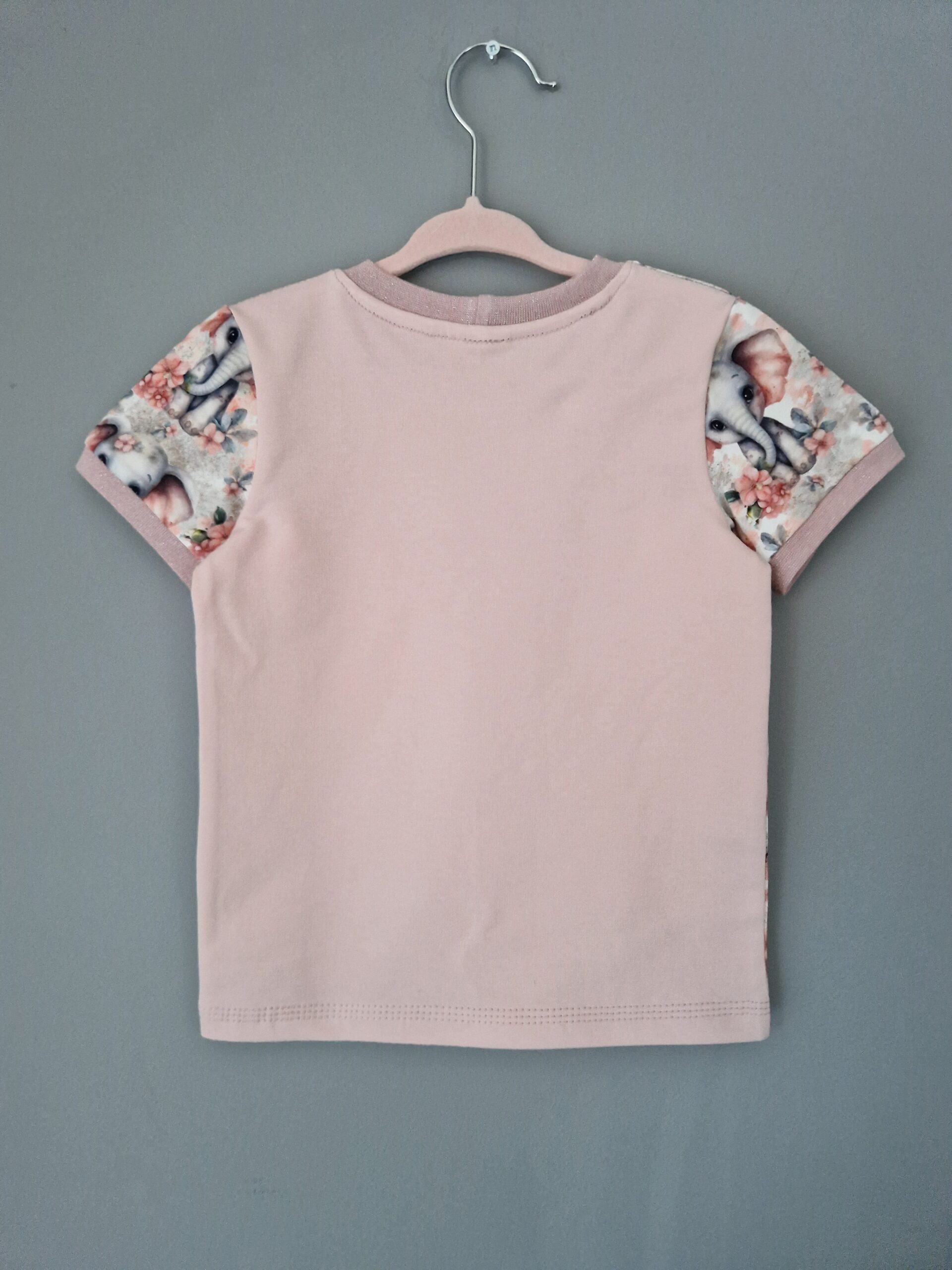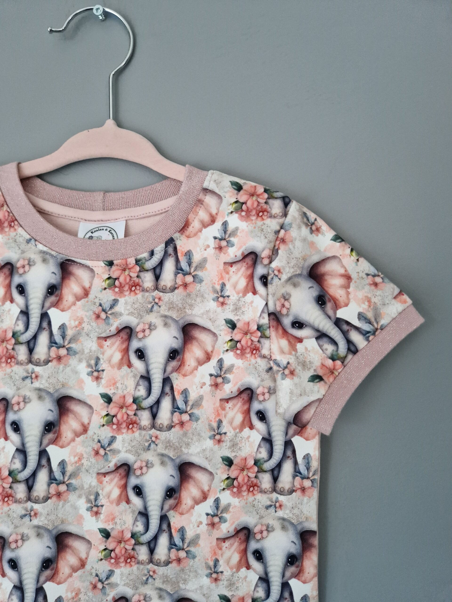 Söt t-shirt med elefanter i joggingtyg med matchande rosa baksida.